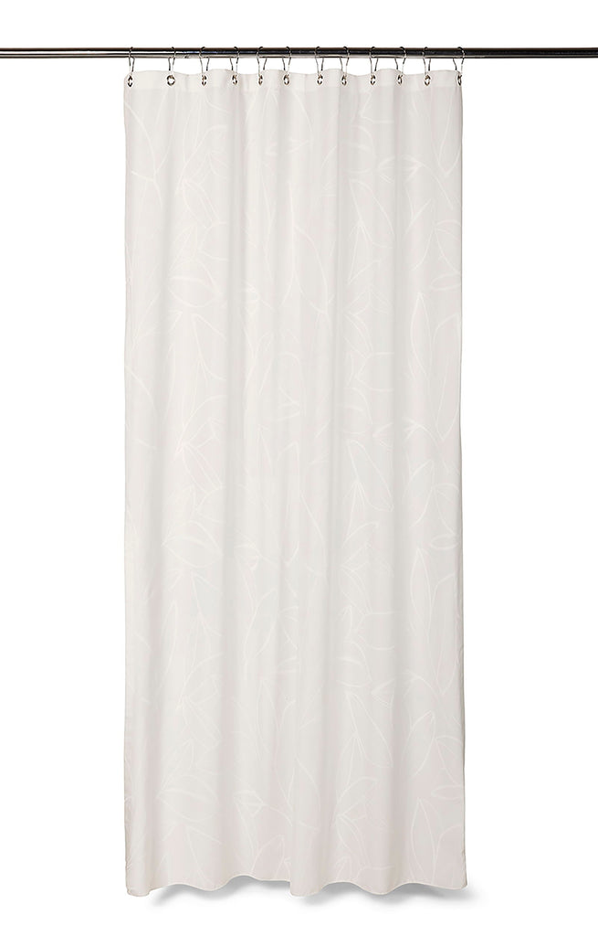 Exclusive antibacterial treated shower curtain. White on white abstract leaves print. 12 eyelets for easy and beautiful hanging. Combine with your favorite Compliments towel and bath mat.