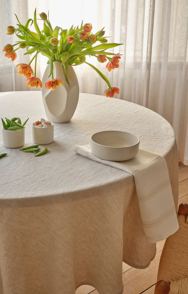 ARLES is understated luxury in a lovely mix of linen and cotton. The plain and rustic linen texture makes the table cloth look refined yet casual.